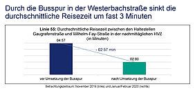 Drei Minuten – nicht viel Zeit, möchte man meinen. Um diese drei Minuten hat sich die durchschnittliche Fahrzeit der Buslinie 55 zwischen den Haltestellen Gaugrafenstraße und Wilhelm-Fay-Straße durch Einrichtung einer Busspur in der Westerbachstraße im nachmittäglichen Berufsverkehr verringert. Im Verhältnis bedeutet das eine Reduzierung der Fahrzeit zwischen den beiden Haltestellen von fünf auf zwei Minuten, also um 60 Prozent. In der nachmittäglichen Hauptverkehrszeit erreichen jetzt 77 Prozent aller Busse die Wilhelm-Fay-Straße pünktlich, zuvor waren es nur 67 Prozent. Insgesamt stieg die Pünktlichkeit der Linie 55 an dieser Haltestelle von zuvor 86 Prozent auf jetzt 91 Prozent. Die jährliche Kostenersparnis durch diese drei Minuten beträgt 12.000 Euro.