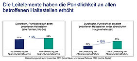 Die Bilanz ist auch hier eindeutig positiv: Die Betriebsqualität der betroffenen Straßenbahnen konnte erhöht werden, die Zahl der Brems- und Haltevorgänge nahm ebenso ab wie die Zahl der Beinahe-Unfälle. An allen betroffenen Haltestellen fuhren vier Prozent der Straßenbahnen pünktlicher ab als zuvor. Im nachmittäglichen Berufsverkehr stieg die Zahl der pünktlichen Abfahrten an den Haltestellen von 60 auf 75 Prozent an.