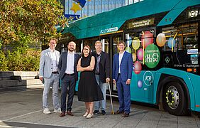„Leistungsfähige Verkehrssysteme sind das Rückgrat der Wirtschaftsmetropole Frankfurt. Aber zukunftsfähig sind diese nur, wenn sie null Emissionen aufweisen. Deshalb freue ich mich, heute zusammen mit den Frankfurter Nahverkehrsexperten das Startsignal für ein Projekt zu geben, das hervorragend zur Hessischen Wasserstoffstrategie passt: den Probebetrieb von 13 Wasserstoffbussen in Frankfurt“, sagt Staatssekretär Jens Deutschendorf bei der Präsentation des neuen Bustyps Solaris Hydrogen nU12 mitten in der Frankfurter City.