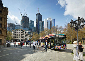 In Frankfurt ist der Einsatz von Wasserstoffbussen ein notwendiger Schritt für den lokalen Busverkehr: Nur mit diesem Antrieb können derzeit längere Linienwege emissionsfrei gestellt werden. Prof. Dr.-Ing. Tom Reinhold, Geschäftsführer der städtischen Nahverkehrsgesellschaft traffiQ: „Mit den reichweitenstarken Wasserstoffbussen kann die Stadt Linien auf schadstofffreien Betrieb umstellen, auf denen die Busse täglich hohe Kilometerleistungen erbringen müssen. Ab dem Frühjahr 2024 soll mit den zehn neuen ICB-Bussen die Linie 64 elektrifiziert werden.“ Diese Linie führt über Hauptverkehrsadern und dicht besiedelte, innerstädtische Viertel von Ginnheim über Dornbusch, Alte Oper, Hauptbahnhof und Messe ins Europaviertel. Etwa 4.800 Fahrgäste nutzen die 64 an Werktagen. Durch die Umstellung der Linie fallen lokal pro Jahr 640 Tonnen Kohlendioxid (CO2) und rund 8,4 Tonnen Stickoxid (NOx) weniger an.
