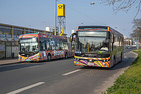 Fotohinweis: Mit der Quartierbuslinie 87 kommt man bald ganz bequem zum Supermarkt. Die elektrischen „Stromer“-Busse der Linien 37 und 87 fahren sauber und leise durch die Gutleutstraße. Copyright: traffiQ, Helmut Vogler.