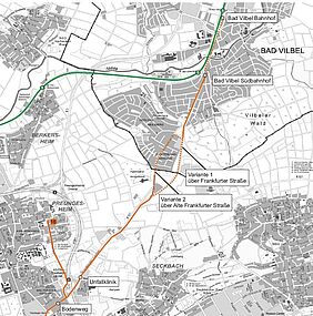 Frankfurt am Main und Bad Vilbel werden gemeinsam die Potenzialstudie in Auftrag geben. „Die zu untersuchende Straßenbahnverbindung zweigt nördlich der Friedberger Warte in Frankfurt (Haltestelle Bodenweg) von der bestehenden Straßenbahnlinie 18 ab und verläuft weiter im Bereich der Friedberger Landstraße. Ab der Stadtgrenze zu Bad Vilbel gibt es zwei Trassenvarianten: Eine verläuft direkt entlang der Frankfurter Straße. Die andere folgt dem heutigen Verlauf der Buslinie 30 über die Alte Frankfurter Straße. Beide Varianten führen ab dem Heilsberg wieder gemeinsam auf der Frankfurter Straße bis zum Südbahnhof in Bad Vilbel“, beschreibt der Frankfurter Verkehrsdezernent Klaus Oesterling den Plan.